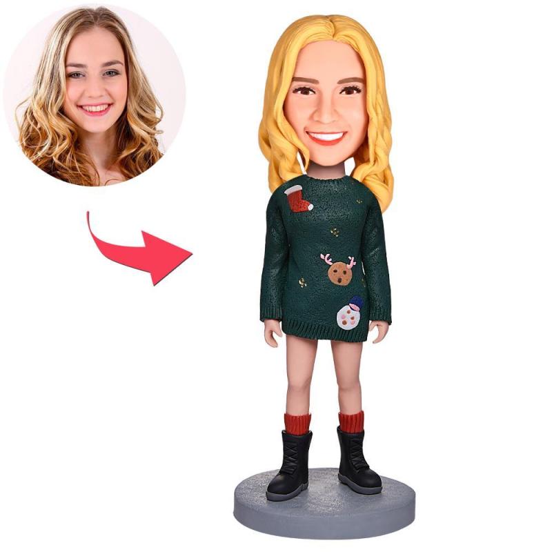 Christmas Girl In Green Dress Custom Bobblehead With Engraved Text