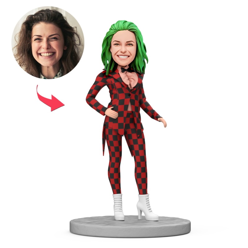 Custom Woman in Red and Black Checkerboard Suit Custom Bobbleheads With Engraved Text Gift