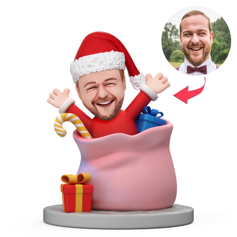 Santa Claus Hiding in a Gift Bag Custom Bobbleheads With Engraved Text Gift for Christmas