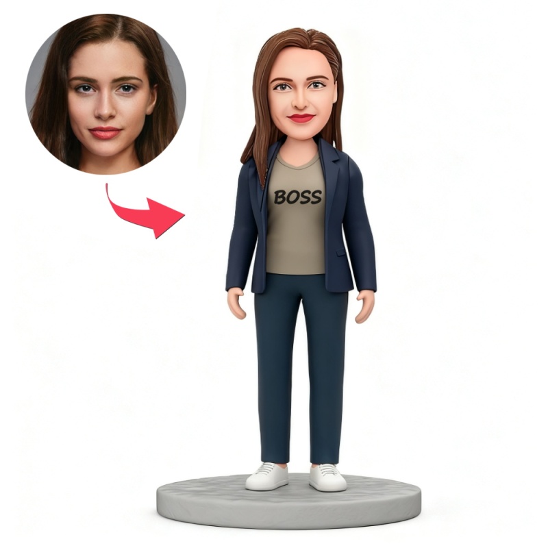Custom Female Boss in a Suit Wearing a Boss T-shirt Custom Bobblehead with Engraved Text